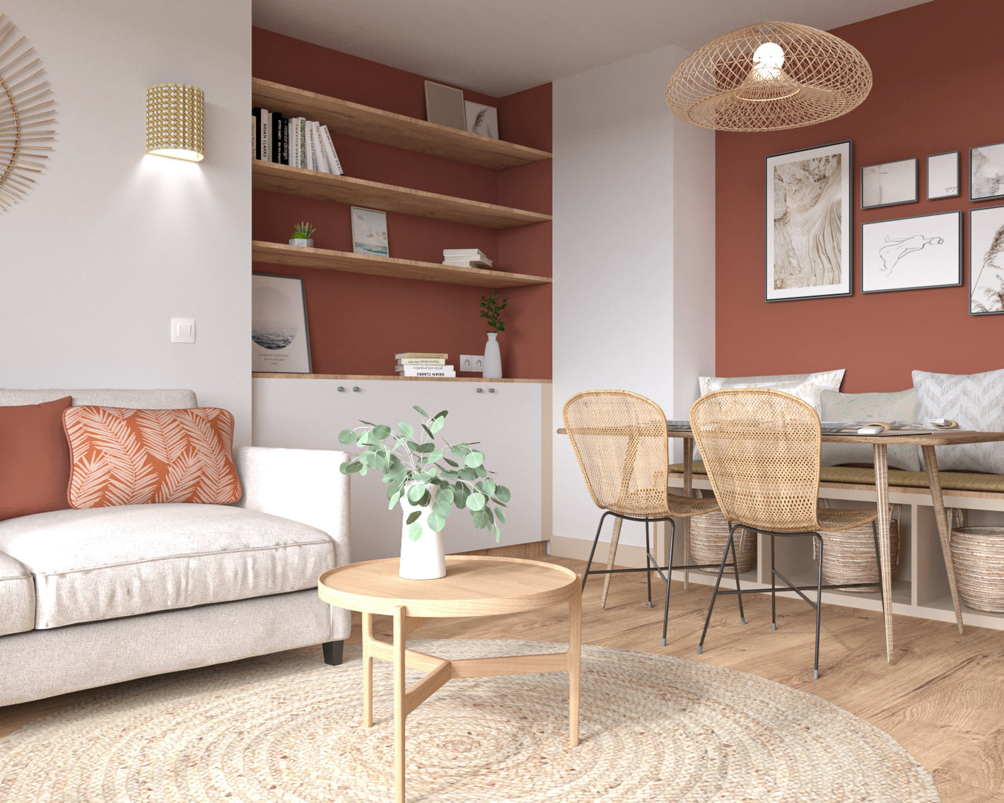 Rénovation et ameublement de cet appartement en résidence secondaire à Lacanau Océan. Le propriétaire a choisi le style "Terracotta" associé à du mobilier épuré aux lignes légères.